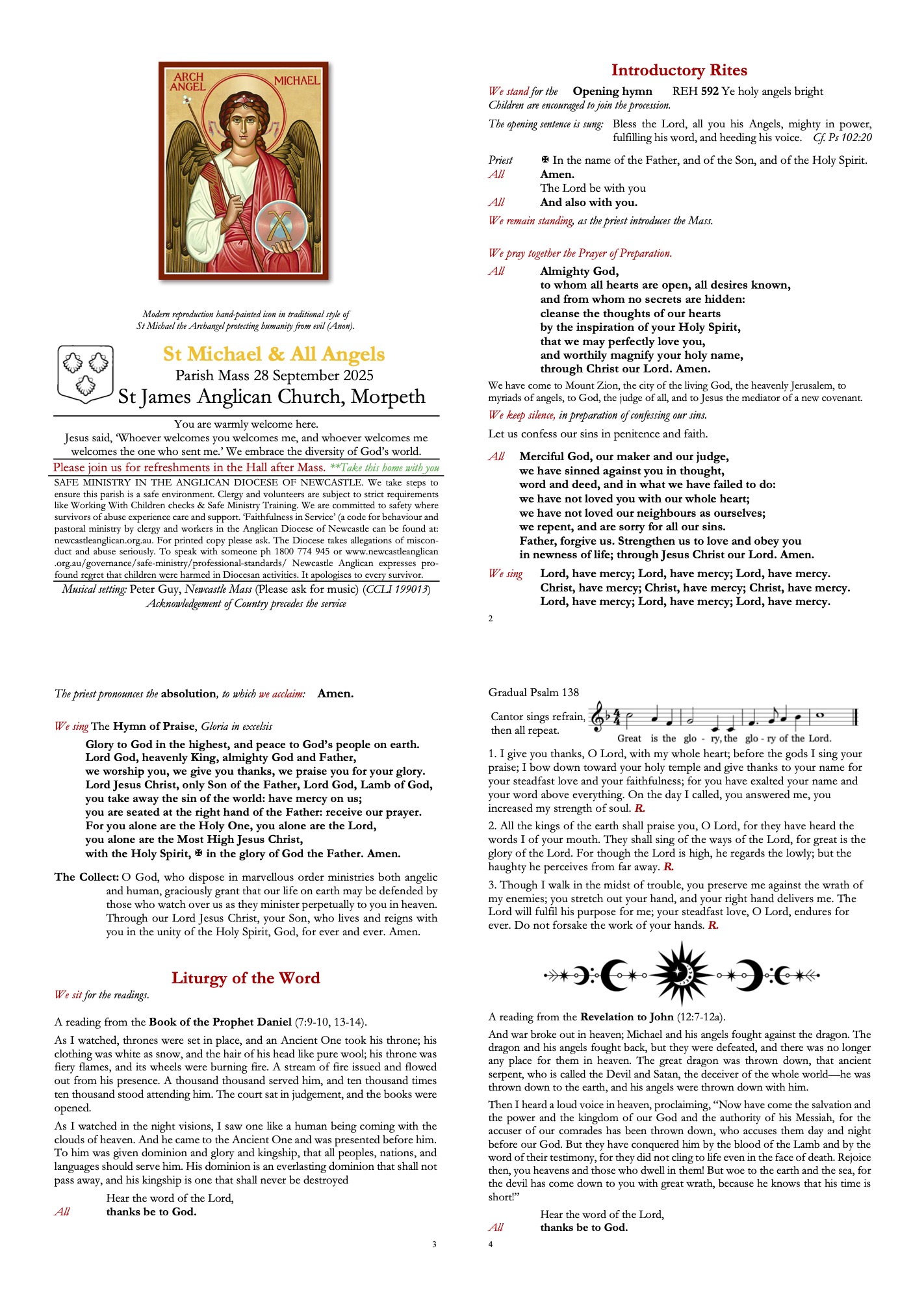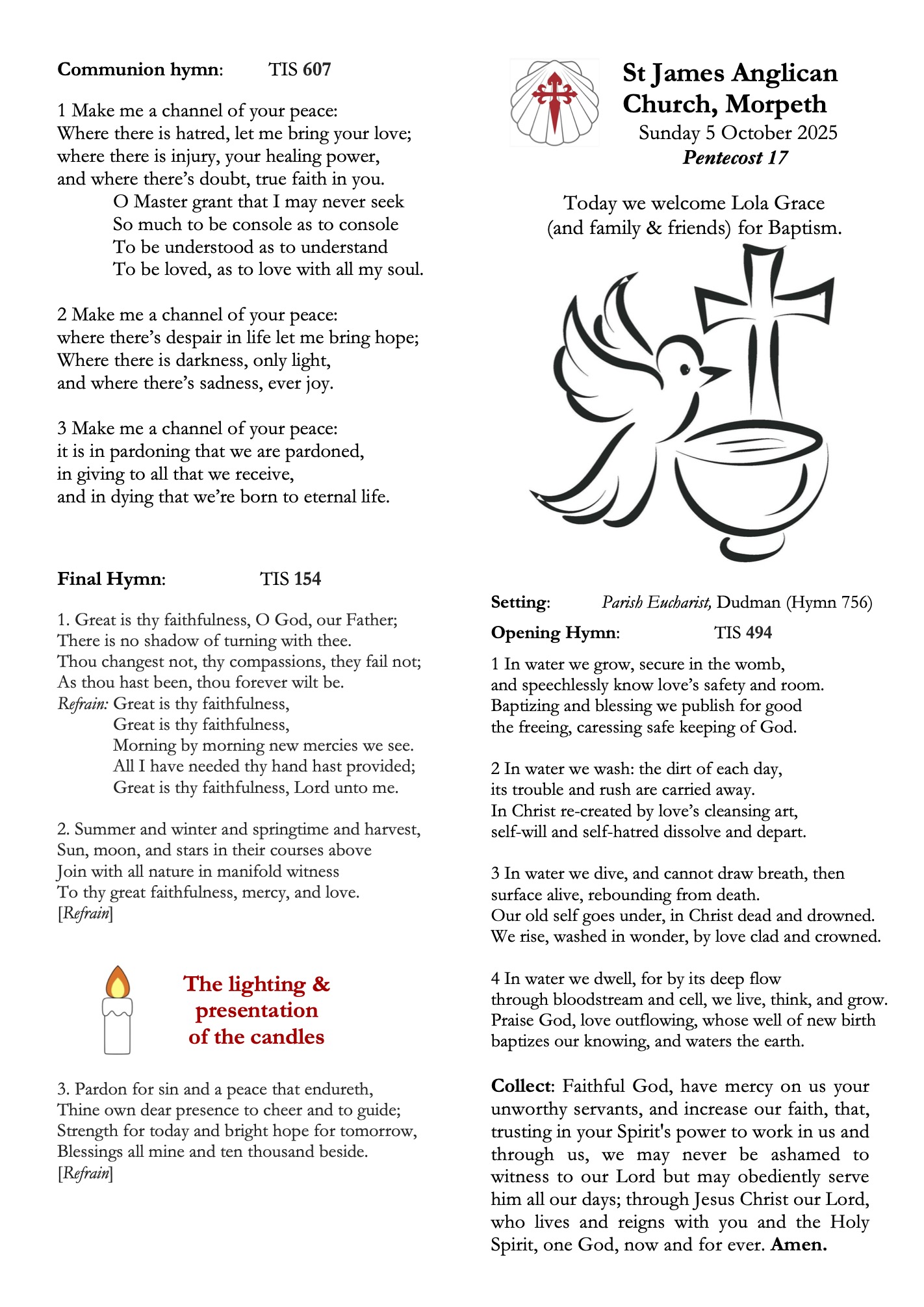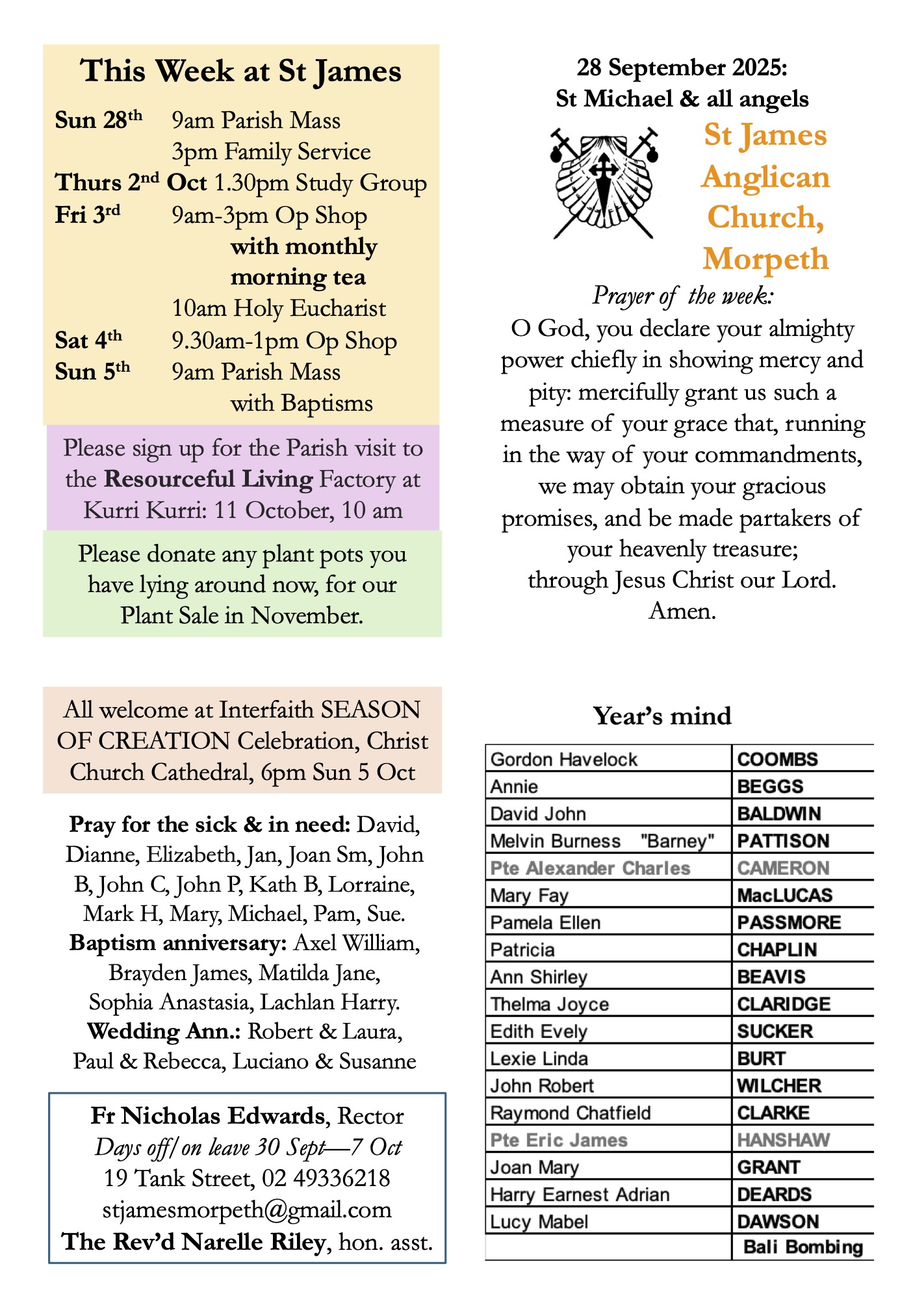 Sunday: 9am Parish Mass (Eucharist) each week. Sunday School on the 1st and 3rd Sundays (Sunday School not in school hols)